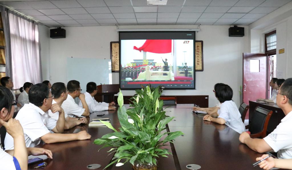 礼炮声声震寰宇,国旗冉冉耀东方。习近平总书记在天安门城楼上发表重要讲话,“中国人民绝不允许任何外来势力欺负、压迫、奴役我们,谁妄想这样干,必将在14亿多中国人民用血肉铸成的钢铁长城面前碰得头破血流”,“江山就是人民、人民就是江山”,“伟大、光荣、正确的中国共产党万岁!”,“伟大、光荣、英雄的中国人民万岁!”。习近平总书记的讲话声声有力,句句铿锵,引起公司全体党员同志掌声雷动,经久不息。
