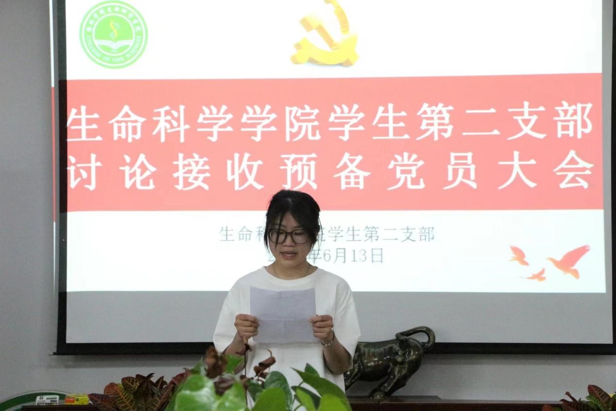 大会第一项议程由徐雨萱等8名发展对象汇报对党的认识、入党动机、本人履历、家庭和主要社会情况及需向党组织说明的问题。第二项议程为发展对象的培养联系人汇报其一年来的表现情况。第三项议程,李帼茹同志代表第二支部委员会报告徐雨萱等8名发展对象的政治审查情况。第四项议程,全体参会党员对徐雨萱等8名发展对象能否入党进行充分讨论,并发表看法和建议。第五项议程,发展对象离场,正式党员同志对徐雨萱等8名发展对象能否入党进行表决。经支部委员会研究决定,同意接收徐雨萱等8名同志为预备党员。封瑞超同志带领新同志进行入党宣誓,并为他们佩戴党徽,其他党员同志重温入党誓词。徐雨萱等8名同志在会上对自身不足和努力方向做表态发言。