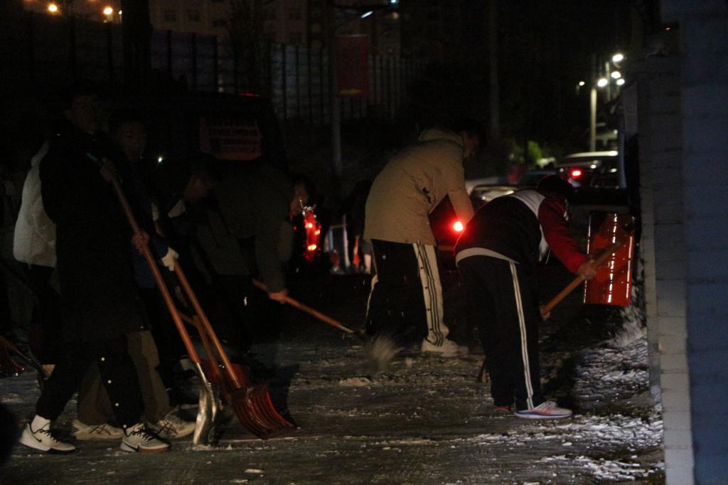 雪后的榆林,平均气温骤降十摄氏度,最低温度达到了-9℃。但寒冷的天气并未减弱师生们的热情,大伙儿你一铁锹,我一雪铲,合力将积雪推到路边。经过四个多小时的共同努力,道路上的积雪和暗冰已清理干净,基本保证了过往行人与车辆安全畅通。穿着厚重棉服的生科师生,尽管都很疲惫,但每个人脸上却都洋溢着笑容,路边商户也不禁为公司学子点赞叫好