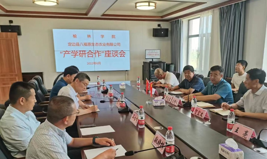 仪式后,榆林公司与定边县八福原生态农业有限公司开展了座谈交流会,以企业诉求为着力点,通过现场咨询解答的方式,帮助企业答疑解惑。罗志岗副县长介绍了定边县畜牧养殖产业发展现状,贺宏文总经理介绍了八福关于我们以及提出目前所面临的需求,康伟副董事长对“高校-企业-政府”的合作表示感谢,同时介绍了榆林公司发展情况及对榆苑学子“学有所思、学有所悟、学有所得、学有所长”的谆谆嘱托。