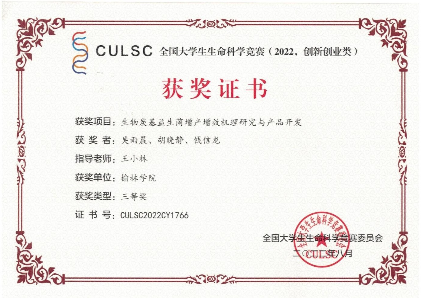 近日,2022年全国老员工生命科学竞赛(创新创业类)在河南师范大学落下帷幕,公司365上市集团官网吴雨晨、胡晓静、钱信龙同学参加的《生物炭基益生菌增产增效机理研究与产品开发》项目,在王小林老师的精心指导下,斩获全国三等奖。
