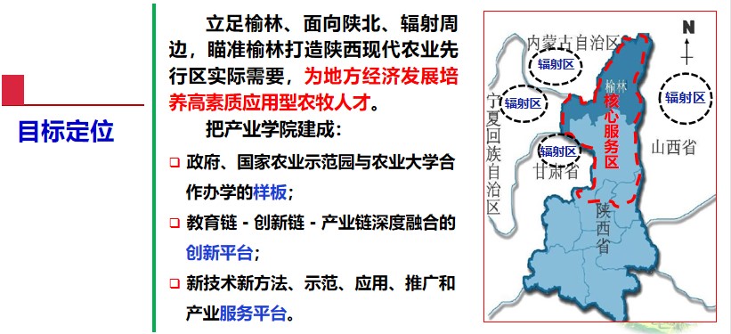 党的二十大报告中明确提出以中国式现代化全面推进中华民族伟大复兴,农业农村现代化是中国式现代化中的重要组成部分。乡村要振兴,人才是关键,产业是基础。榆林市是我国优质马铃薯、玉米、小杂粮及绒山羊等特色农畜的主产区,当前正处于加快推进现代农业提质增效,全力打造陕西现代农业先行区的关键时期,高素质应用型农牧人才十分紧缺,按照现代产业公司的模式进行人才培养迫在眉睫。