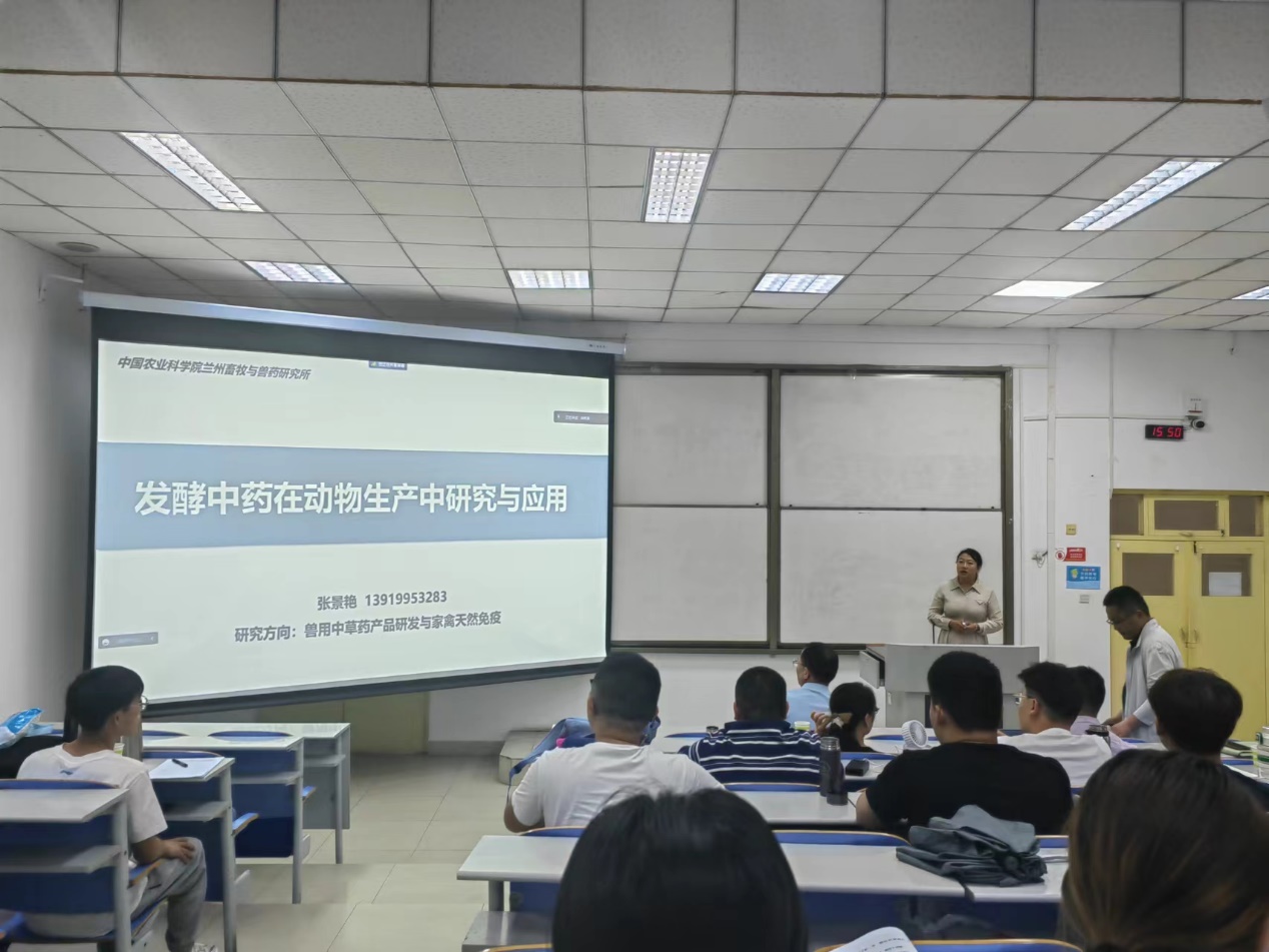 在5201教室,董书伟副教授介绍了两位专家的研究方向及近年来取得的科研成果。王慧研究员作“锰暴露激活cGAS−STING通路抑制Tau自噬降解的机制及肠道菌群移植的保护作用”的报告,介绍了金属元素锰(Mn)暴露导致的神经毒性及引发神经退行性疾病的作用机制,并利用粪菌移植(FMT)技术缓解病情的动物临床试验。张景艳副研究员介绍了发酵中药在动物生产中的研究与应用,利用微生物的生长代谢来发酵中药,从而研发出更高效、适口性好和低成本的中草药饲料添加剂,满足我国畜牧行业减抗替抗的需求。他们还分别介绍了兰州大学和中国农业科公司的发展情况和研究生招生情况,为公司员工的深造学习指明了方向。两位专家的报告深入浅出、引人入胜,师生们就感兴趣的话题与专家们进行互动交流。