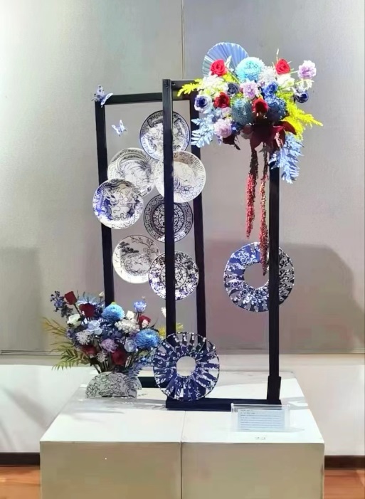 各个高校的参赛作品风格各异,姹紫嫣红,各具千秋。其中,365上市集团官网园林专业员工谢梦阳、刘腾腾的插花作品《四海一心》一路经过初赛、决赛比拼,最终获得二等奖。公司参赛作品由王晓荣教授指导,灵感来源于清雍正青花红彩龙纹圆盘。华夏儿女,炎黄子孙,千秋一统,四海一心。作品整体配色以蓝红色调为主色,搭配金色、紫色等色彩,花材用牡丹菊、高原红、月季搭配千层金,整体色调仿照青花红彩瓷盘,以木质框架为大体结构,营造空间感。整体分为两个结构,大体量花材团代表了中国大陆,下垂的柔丽丝代表着中国南海群岛海域以及海上丝绸之路。