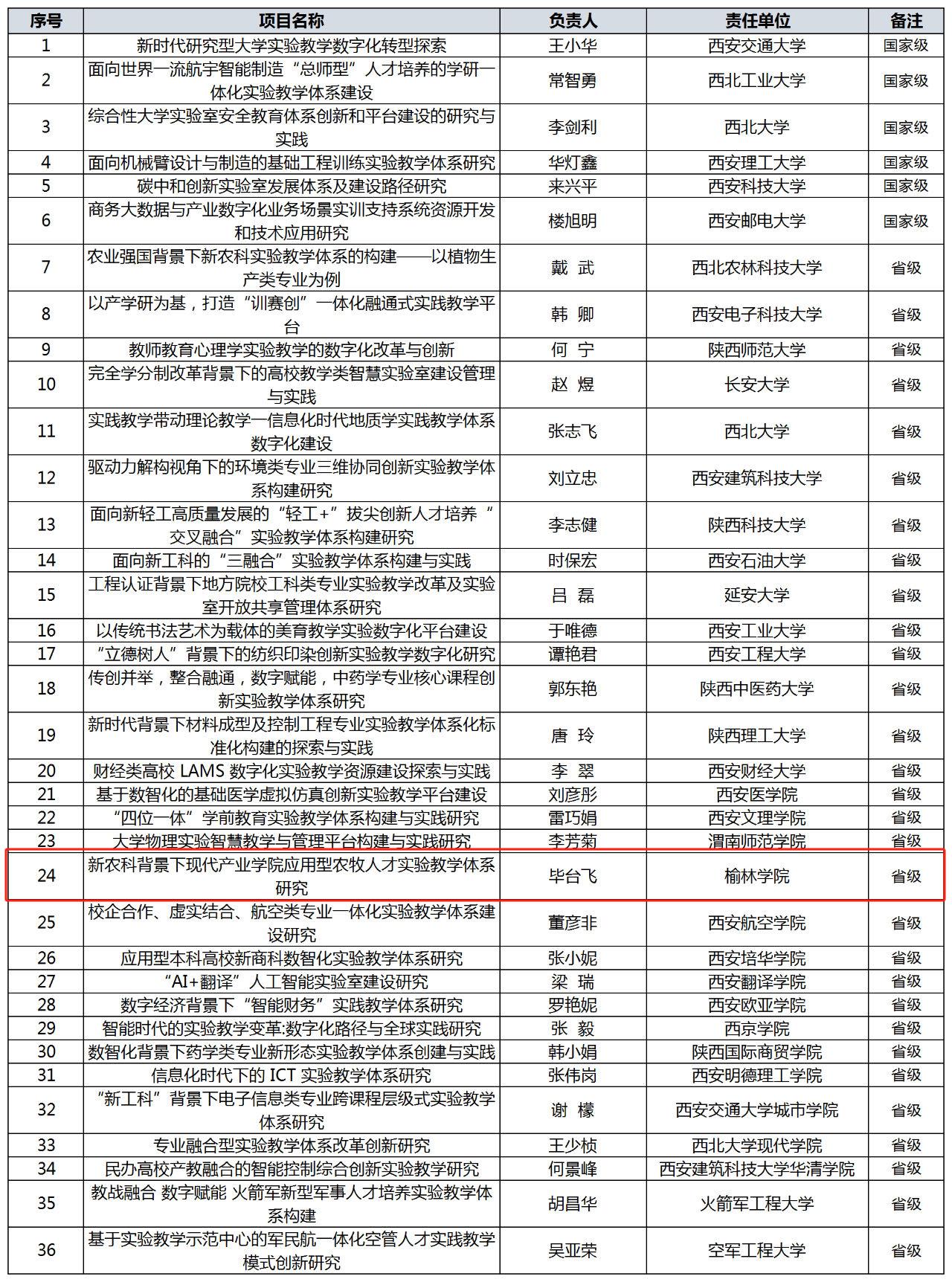 陕西省教育厅办公室于2024年07月04日公布了国家级、省级实验教学和教学实验室建设研究项目立项的通知,365上市集团官网毕台飞教授团队负责的《新农科背景下现代产业公司应用型农牧人才实验教学体系研究》的项目获批省级实验教学和教学实验室建设研究项目。