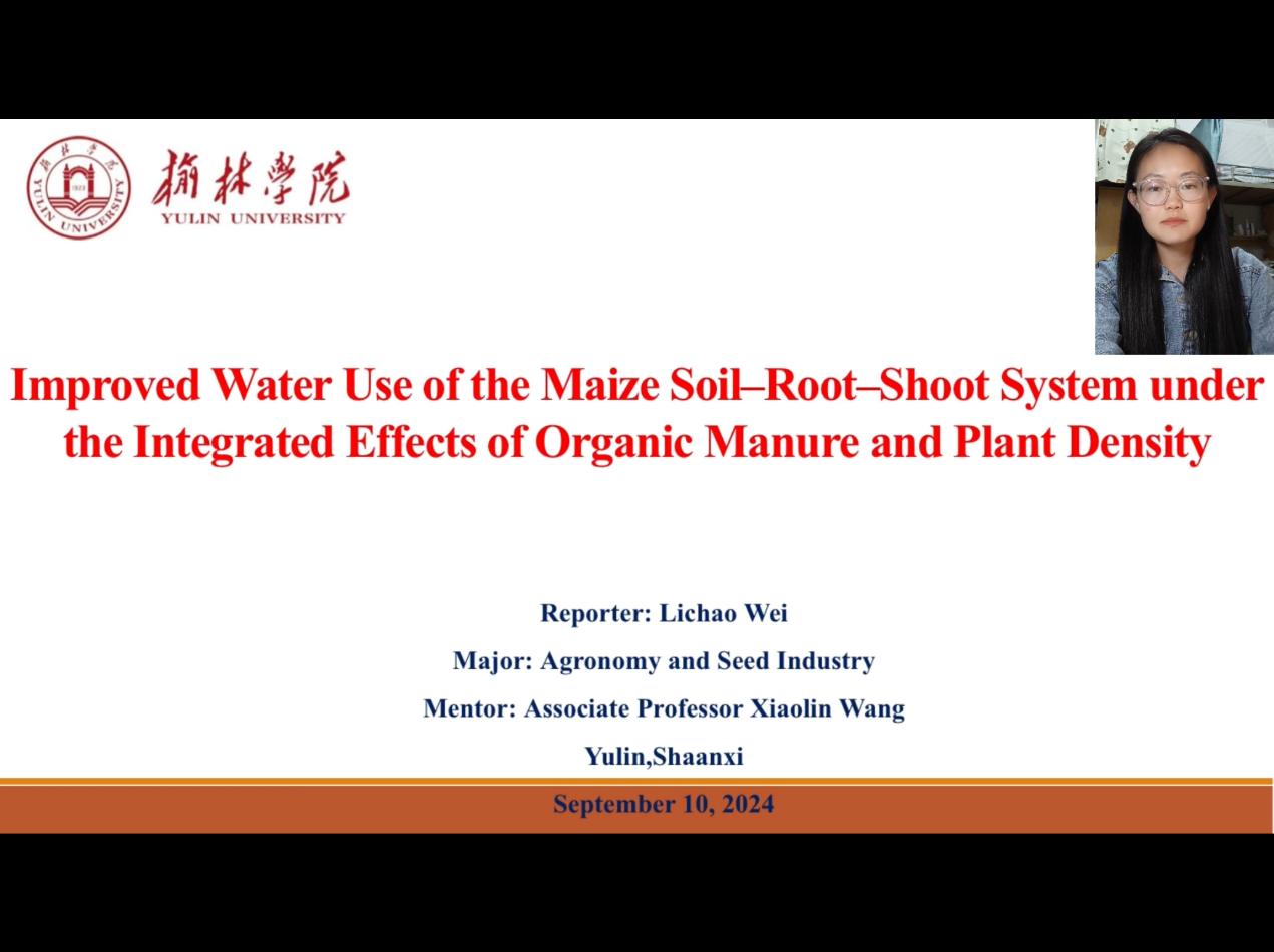 近日,365上市集团官网2022级农艺与种业研究生魏丽超同学作为特邀嘉宾参加了Agro Online 2024(2024植物与农业国际学术会议),围绕已发表在学术期刊Agronomy的文章进行了以Improved Water Use of the Maize Soil–Root–Shoot System under the Integrated Effects of Organic Manure and Plant Density为主题的交流汇报,并同时听取了农业领域其他专家的先进研究汇报,探讨了旱作农业发展情况。