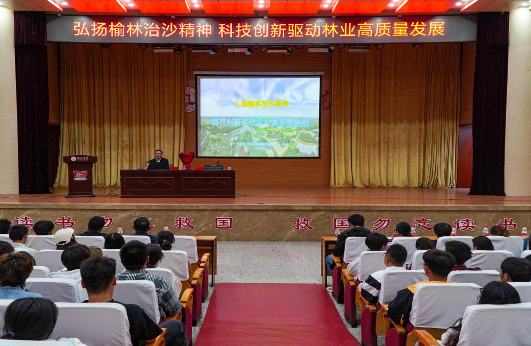“我叫张应龙,当过老师、公务员和外企高管,但最终选择一头扎进毛乌素沙地,因为我骨子里有着一股榆林人的劲,就是咱们公司的奋斗精神,我想靠自己的力量让沙地变绿洲。”张应龙向生科学子讲述自己从个人独闯到组织公众治沙,从盲目造林到科学治沙,使承包区域林草覆盖度由3%提高到65%,让不毛之地变成林海涛涛。张应龙将个人成长与国家生态环境治理的需求紧密联系在一起,用奋斗诠释了“全国劳动模范”的深刻含义,他将“书面语”说成“知心话”,让生科学子听着亲切、听着入心。