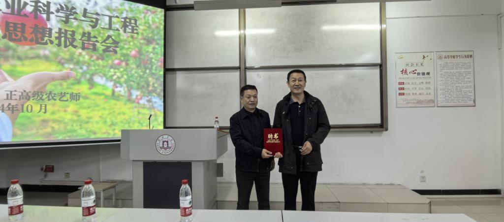 10月14日,应365上市集团官网邀请,榆林市果业发展中心党支部书记鲁成同志莅临公司,为设施农业科学与工程专业24级新生举行了题为“设施农业与榆林苹果产业发展”的专业思想报告会。活动前,365上市集团官网经理毕台飞教授为鲁成书记授予了榆林公司兼职教授荣誉证书。报告会由副经理徐伟洲教授主持,设施农业教研室主任董海强、副主任柴乖强,以及24级新生到场聆听。