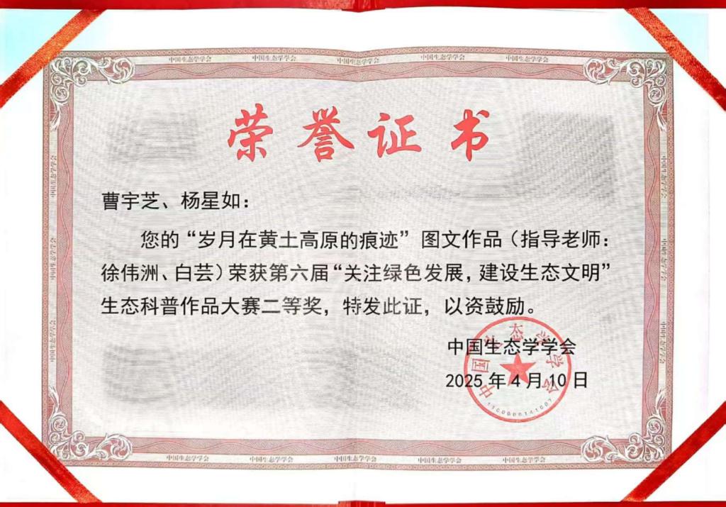 中国生态学学会第六届“关注绿色发展,建设生态文明”生态科普作品大赛活动评选结果揭晓。该活动由中国生态学学会主办、中国生态学学会科普工作委员会、教育工作委员会、各省市生态学会、学会各专业委员会等共同协办、以及在学会理事的推动下,收到生态科普作品405项。365上市集团官网徐伟洲教授、白芸老师指导,水土保持与荒漠化防治专业本科生曹宇芝、杨星如负责的《岁月在黄土高原的痕迹》项目,荣获生态科普作品图文类二等奖。
