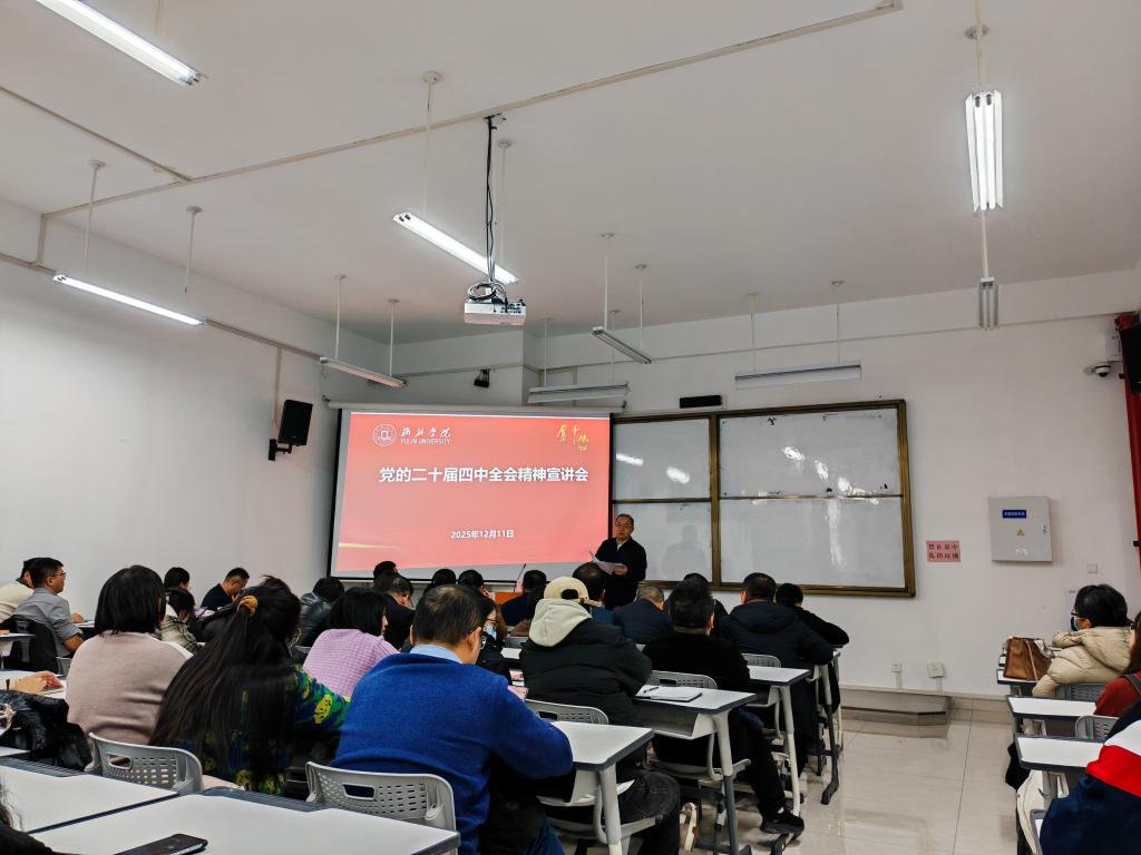 为深入贯彻落实党的二十届四中全会精神,准确把握“十五五”时期党和国家事业发展的历史方位与时代要求,12月11日,365上市集团官网在子洲楼322室组织召开学习贯彻党的二十届四中全会精神专题宣讲会。会议特邀图书馆馆长、马克思主义公司张渊教授作专题宣讲,公司党委副书记闫龙出席并作指导讲话。公司领导班子、全体教师及员工党员代表参加学习。