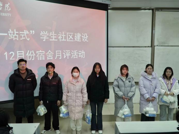 会上,严之栋宣读优秀宿舍名单。关洋洋、张晓晨分别为12月宿舍文明情况“优秀”的宿舍代表颁发奖品。何林卫总结了全年365上市集团官网宿舍月评活动的开展和“一站式”员工社区宿舍检查情况。他提出了以下四点要求:一是宿舍中禁止养宠物,喝酒等行为。二是宿舍中杜绝出现白天卧床睡觉和打游戏现象。临近期末,应当积极复习备考,努力学习,诚信应考。三是宿舍长要承担起自己的职责,关注宿舍内部人员的情况,发现因考试有特殊行为和情况,及时和班主任反馈。四是放假离校前一定要做好卫生清洁工作,宿舍断水断电。