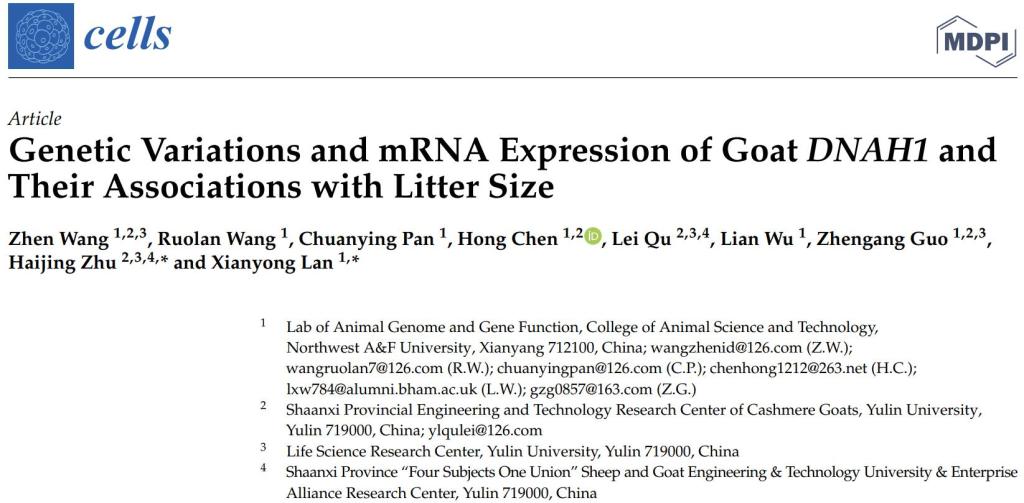 日前,西北农林科技大学蓝贤勇教授与公司朱海鲸副教授联合培养研究生王真的研究成果被高水平期刊Cells(中科院分区:二区;影响因子:6.6)接受,现已发表(Wang, Z.; Wang, R.; Pan, C.; Chen, H.; Qu, L.; Wu, L.; Guo, Z.; Zhu, H.; Lan, X. Genetic Variations and mRNA Expression of Goat DNAH1 and Their Associations with Litter Size. Cells 2022, 11, 1371.https://doi.org/10.3390/cells11081371)。