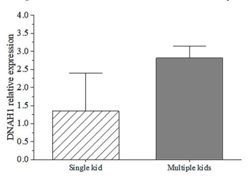 论文系统分析了陕北白绒山羊群体中DNAH1基因的多态性及其与陕北白绒山羊生产性状的相关性,共检测了陕北白绒山羊群体中DNAH1基因的10个SNP位点,3个InDel位点和3个CNV位点,其中发现3个SNP位点、1个27-bp InDel位点及3个CNV突变均显著影响其产羔性状,具有AA-TT-CC-II-M1-M2-M3和AA-TT-CC-II-G1-G2-M3突变组合的个体明显具有更高的产羔能力。并且,山羊DNAH1基因在产双羔母羊群体表达量更高,结果说明DNAH1基因是调控山羊繁殖能力的重要候选基因。