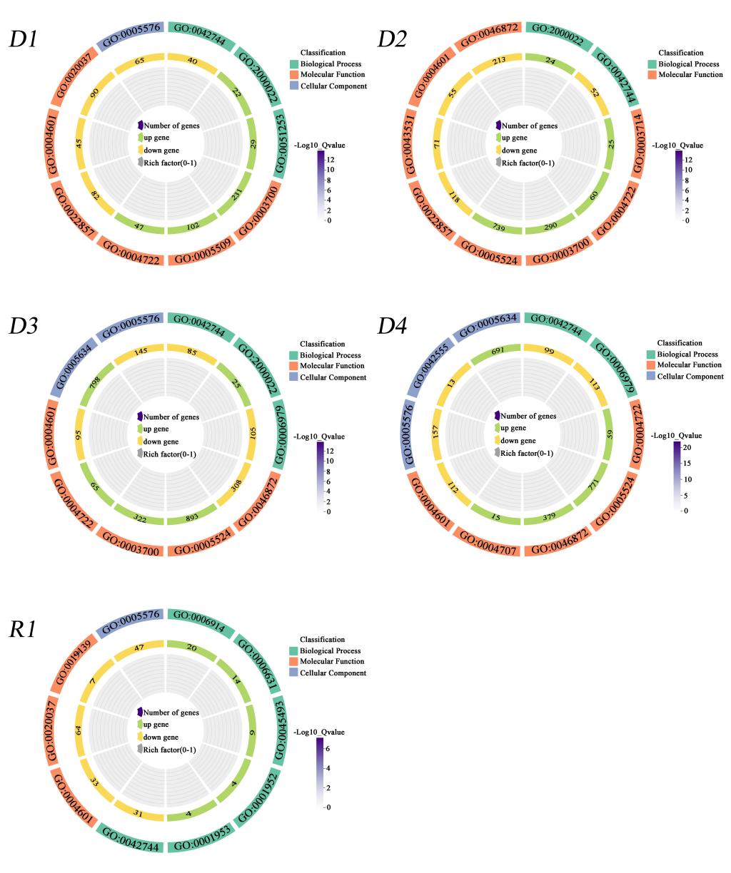 糜子(Panicum miliacum L.)对非生物胁迫具有较强的抗逆性,特别是干旱。然而,其根部适应和耐受干旱胁迫的机制尚不清楚。本研究以榆糜2号为试验材料,通过分析20% PEG-6000模拟干旱胁迫下0、0.5、1.0、1.5和3.0 h以及复水24 h的糜子幼苗根系生理指标和转录组数据,阐明糜子根系响应干旱胁迫的分子机制。研究结果表明:随着干旱胁迫时间的延长,SOD活性、POD活性、可溶性蛋白含量、丙二醛和超氧阴离子自由基含量显著增加,但在复水后迅速下降。18个样品共获得130.46 Gb Clean Data,Q30碱基百分比均超过92%。差异表达基因数量(DEGs)在干旱3 h后达到最大值16105个。干旱条件下,上调的DEGs主要参与ATP结合、细胞核、蛋白丝氨酸/苏氨酸磷酸酶活性、MAPK信号通路-植物、植物-病原体相互作用以及植物激素信号转导,而下调的DEGs主要参与金属离子结合、跨膜转运蛋白活性和苯丙烷类物质生物合成。1441个转录因子聚类为64个TF家族,如AP2/ERF-ERF, bhh, WRKY, NAC, MYB和bZIP TF家族。生理性状相关基因与淀粉和蔗糖代谢、苯丙素生物合成、谷胱甘肽代谢、植物激素信号转导等密切相关。综上所述,蛋白丝氨酸/苏氨酸磷酸酶活性可调控糜子根活性氧代谢系统和可溶性蛋白。AP2/ERF-ERF、bHLH、WRKY、NAC、MYB和bZIP 转录因子家族与糜子根系抗旱性密切相关。本研究将为后续糜子耐旱基因功能的研究提供数据支持。