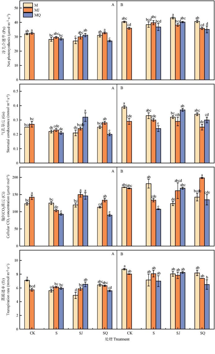 课题组于2022年在榆林市榆阳区和神木市的两个试验点同步开展试验,采用两因素完全区组设计,对照组为单作作物(玉米 M、大豆 S)和覆膜方式(裸地、膜际 J)相结合,试验组为间作作物(玉米 M、大豆 S)和覆膜方式(裸地、膜际 J、全膜 Q)相结合,共 13 组处理,研究不同覆膜方式下间作玉米生长、光合特性、水分利用效率及产量的变化。研究表明,与玉米单作相比,玉米膜际+大豆膜际间作模式在水地可改善玉米光合性能,增加玉米地上生物量,提高玉米产量,提升系统经济效益,并促进水分利用效率的提高;在旱地通过间作系统中的互补效应和资源优化分配,维持玉米产量,提高水分利用效率,但农资总投入的增加降低了其经济可行性。因此,在陕北旱作农业中,水地和适量灌溉的旱地条件下均推荐玉米膜际+大豆膜际间作种植模式,以确保在提高水分利用效率的同时,实现增产增效和生态农业可持续发展。