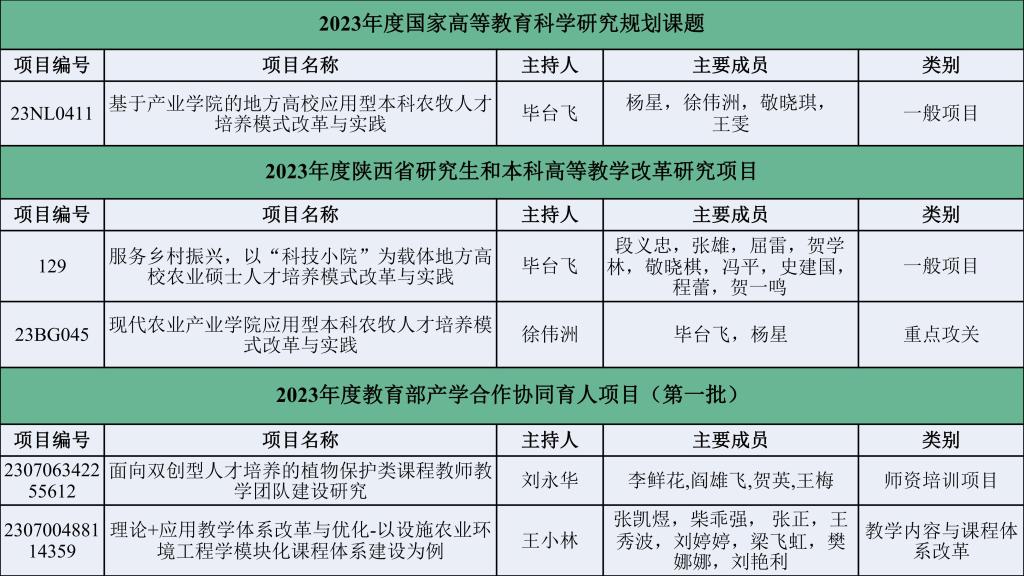 3月18日,陕西省教育厅、陕西省学位委员会《关于公布第二轮陕西省研究生教育综合改革研究与实践项目立项结果的通知》(陕教函〔2023〕243号),毕台飞教授主持申报的“服务乡村振兴,以‘科技小院’为载体地方高校农业硕士人才培养模式改革与实践”获批一般项目。