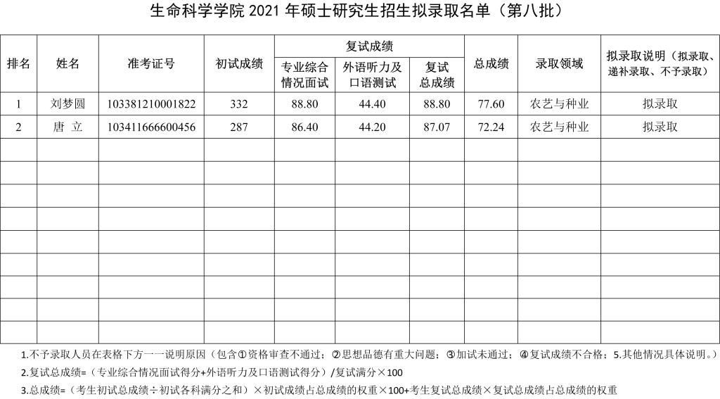 公司于2021年4月10日组织了硕士研究生招生第八批调剂复试录取工作。根据最终成绩,经院系评定,研究生院审核并报校招生工作领导小组审定,现将拟录取名单予以公示,如有异议,请于2021年4月20日前以书面形式报公司研究生招生办公室,逾期不予受理。